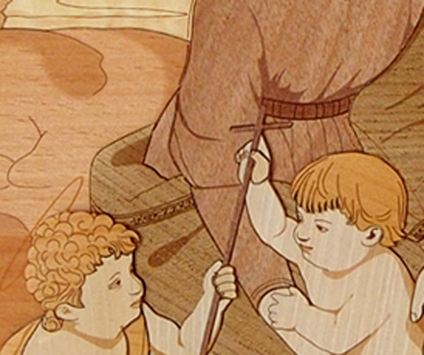 原画では、衣装には赤と青が使われてインパクトがあるのですが、木はり絵ではとても優しい雰囲気になりました。