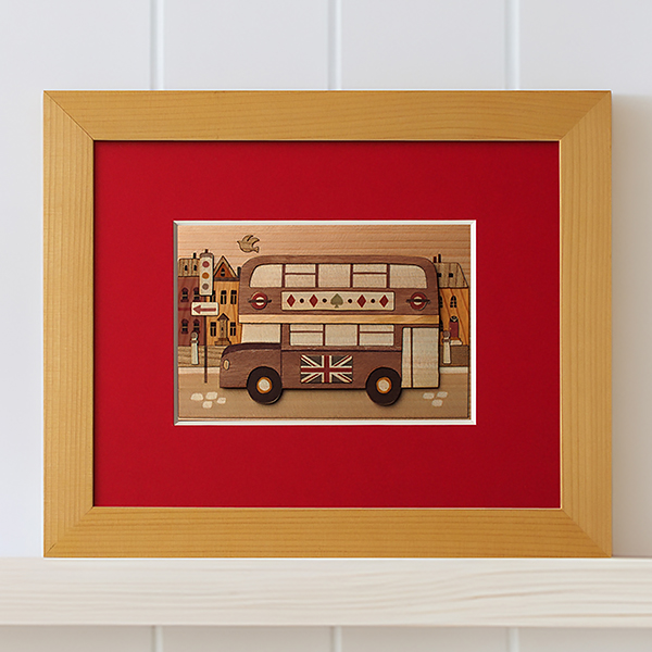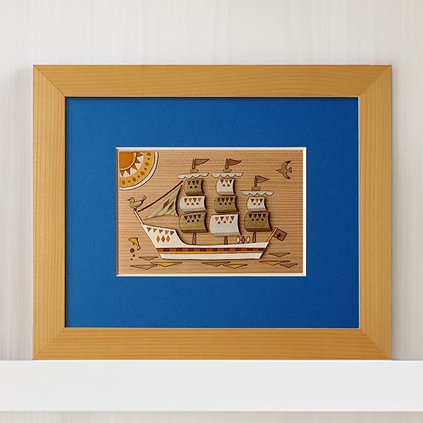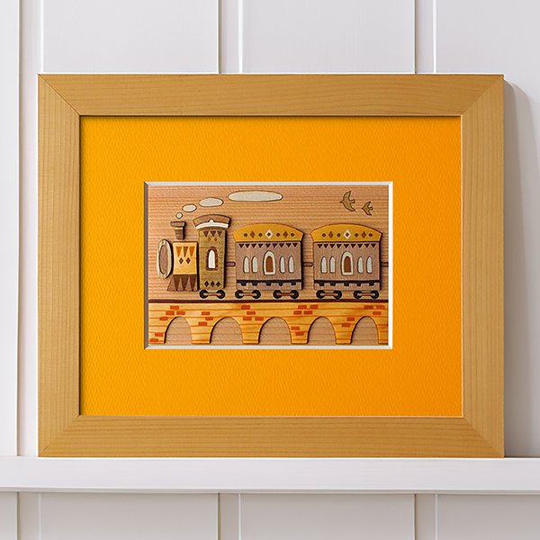 乗り物「のある風景」としたのがミソの、夢いっぱいの木はり絵です。