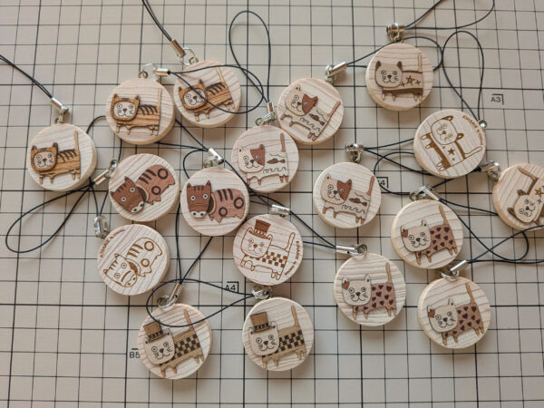 ストラップは表が木はり絵、裏が同じデザインのレーザー刻印になっています。